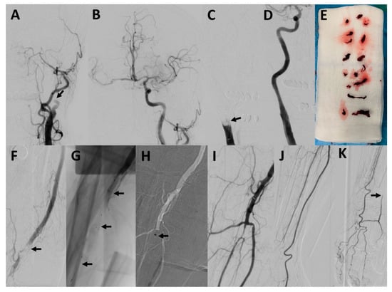 Mechanical thrombectomy of concomitant occlusions of the internal carotid artery, common carotid artery and brachial artery. Patient #2 presented with a left-sided occlusion of the internal carotid artery ((A), arrow), a right-sided occlusion of the common carotid artery ((C), arrow) and an occlusion of the right brachial artery (F, arrow). An occlusion of the V2-segment of the left vertebral artery was also present (not shown) but was not recanalized. After successful recanalization of the left internal carotid artery using direct aspiration (B); with only poor collateralization of the territory of the right internal carotid artery) and of the right common carotid artery using aspiration, balloon dilatation and stenting (D), harboring a lot of thrombus material (E), the right upper limb occlusion was targeted. The brachial artery could be recanalized using one stent retriever maneuver (Neva-T stent retriever marked with arrows in (G) and 3 aspiration maneuvers (arrow pointing at the tip of a 6F Sofia aspiration catheter in (H)). Thrombectomy of the brachial artery was technically successful (I), also harboring several large thrombi (E). The radial artery could not be completely recanalized, but was filled retrogradely (J,K).