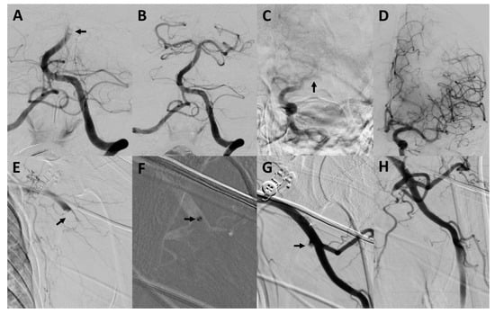 Mechanical thrombectomy of concomitant occlusions of the basilar artery, middle cerebral artery and axillary artery. Patient #3 presented with an occlusion of the distal basilar artery ((A), arrow), a left-sided occlusion of the M1-segment of the middle cerebral artery ((C), arrow) and an occlusion of the left-sided distal axillary artery ((E), arrow). After successful recanalization of the basilar (B) and middle cerebral artery (D), recanalization of the axillary artery was performed. In total, 4 direct aspiration maneuvers were performed for recanalization (arrow in (F) pointing at the tip of a 9F Merci catheter), including an aspiration maneuver for recanalization of the subscapular artery using a 6F Sofia aspiration catheter (arrow in (G)). An angiogram of the recanalized axillary artery is presented in (H).