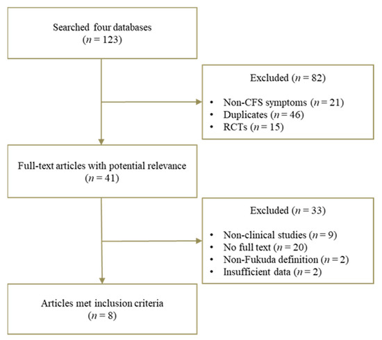 - Kim, D.Y.; Lee, J.S.; Park, S.Y.; Kim, S.J.; Son, C.G. Systematic review of randomized controlled trials for chronic fatigue syndrome/myalgic encephalomyelitis (CFS/ME). J. Transl. Med. 2020, 18, 7. [Google Scholar] [CrossRef]