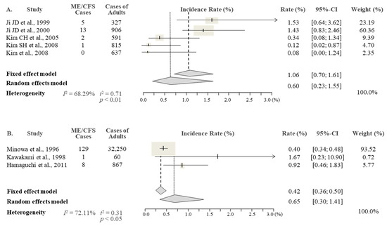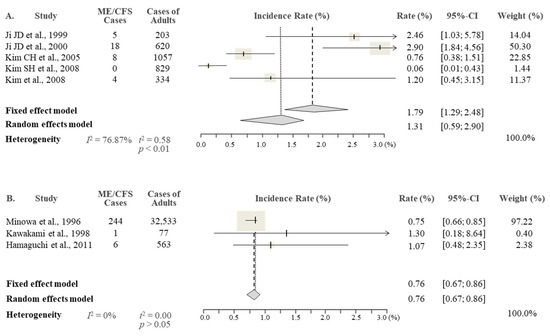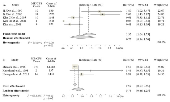 Meta-analysis of the ME/CFS total prevalence in Korea (A) and Japan (B).