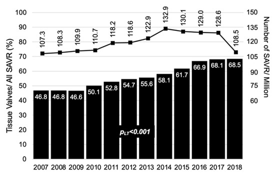 Chicago/Turabian StyleCarnero-Alcázar, Manuel, Emiliano Rodríguez-Caulo, Daniel Hernández-Vaquero, Lourdes Montero-Cruces, Daniel Perez-Camargo, David Fernández-De Velasco, Javier Cobiella-Carnicer, and Luis Maroto-Castellanos. 2021. "Variablity of Mechanical or Tissue Valve Implantation in Patients Undergoing Surgical Aortic Valve Replacement in Spain: National Retrospective Analysis from 2007 to 2018" Journal of Clinical Medicine 10, no. 15: 3209. https://doi.org/10.3390/jcm10153209