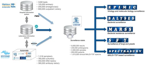 - Abat, C.; Chaudet, H.; Colson, P.; Rolain, J.M.; Raoult, D. Real-time microbiology laboratory surveillance system to detect abnormal events and emerging infections, Marseille, France. Emerg. Infect. Dis. 2015, 21, 1302–1310. [Google Scholar] [CrossRef] [PubMed]
