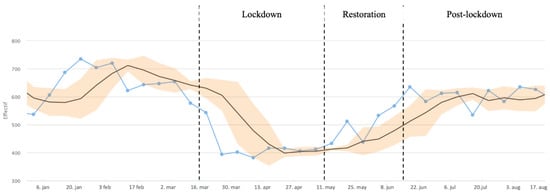 A preliminary descriptive analysis based on BALYSES automatic control boards allowed us to define three a priori periods according to the evolution of the laboratory activity during 2020: a lockdown phase (weeks 12–19), a restoration phase (weeks 20–24) and a post-lockdown phase (weeks 25–35) (Figure 2).