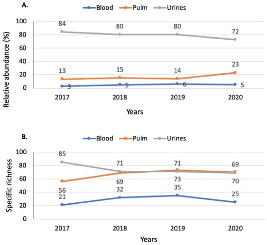 From weeks 12 to 35 in 2017–2020, a total of 349 bacterial and fungal species were identified from 30,918 identifications including 24,946 from urine samples (186 distinct species), 4555 from respiratory samples (230 distinct species), and 1417 from blood samples (111 distinct species). The top twenty species alone represent 87.4% (27,037/30,918) of the total number of identifications. While the relative abundance in respiratory samples for the whole studied period was higher in 2020, it decreased for urine samples and was constant for blood samples (Figure 3A). However, while the species richness was constant over time in respiratory and urine samples it decreased in blood samples (Figure 3B).