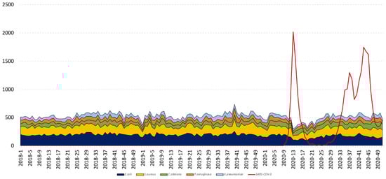 Weekly incidence of the five most identified species in our institute and SARS-CoV-2 from 2018 to 2020, Marseille, France.