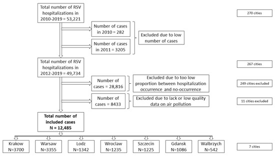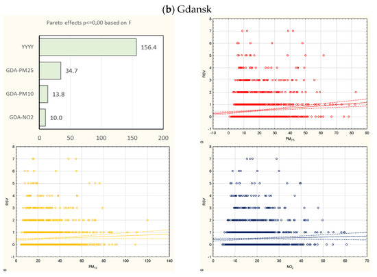 The following are available online at: https://www.mdpi.com/article/10.3390/jcm10153224/s1. Figure S1: The distribution of the RSV cases: (a) annual graph, (b) seasonal graph (cool versus warm season), (c) quarter graph, (d) seasonal and annual graphs combined with corresponding tables (table A—annual, B—seasonal, and C—annual and seasonal). The vertical bars denote 0.95 confidence intervals. The tables show mean and standard error and 95% confidence intervals. Figure S2. The annual boxplots of air pollutants’ (PM2.5, PM10, NO2) concentrations in the studied cities throughout the analysed period (2012–2019). Figure S3. The exemplary results of the city to city comparisons of autocorrelation function (ACF) and partial autocorrelation function (PACF) for Warsaw and Gdansk. Figure S4. The Pareto charts of the effects power (based on the F statistics) and corresponding scatterplots of the air pollutants concentrations and the RSV hospitalizations (sequentially: PM2.5, PM10, NO2) during the RSV high-risk seasons (2012–2019) in selected study sites. Table S1. A correlation between the air pollutants’ concentrations.
