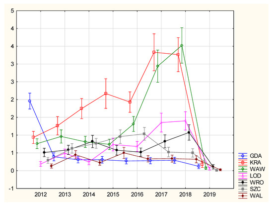 Annual distribution of mean number of RSV cases (per day) in the period included in the analysis. The vertical bars denote 0.95 confidence intervals. Abbreviations for the cities: GDA—Gdansk, WAW—Warsaw, KRA—Krakow, WRO—Wroclaw, LOD—Lodz, SZC—Szczecin, WAL—Walbrzych.
