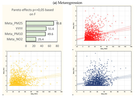 In the univariate model, the most significant effect was observed for PM2.5 and NO2, which showed a significant association with RSV hospitalizations in five out of seven sites, while PM10 showed a significant association in four sites, and the metaregression revealed statistical significance for each of the analyzed parameters.