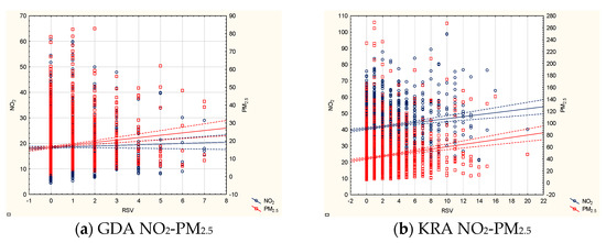 Scatterplots of the interactions between the air pollutant concentrations and RSV hospitalizations during the RSV high-risk season (2012–2019) in the study sites (only significant results are shown): (a) Gdansk: NO2 and PM2.5 against RSV hospitalizations, (b) Krakow: NO2 and PM2.5 against RSV hospitalizations, (c) Krakow: PM10 and PM2.5 against RSV hospitalizations, (d) Krakow: PM10 and NO2 against RSV hospitalizations, (e) Lodz: NO2 and PM2.5 against RSV hospitalizations, (f) Lodz: PM10 and PM2.5 against RSV hospitalizations.
