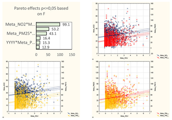 Pareto charts of the effect power (based on the F statistics) and corresponding scatterplots of the air pollutant concentrations and RSV hospitalizations (sequentially: PM2.5, PM10, NO2) during the RSV high-risk seasons (2012–2019) in metaregression, and on the example of Gdansk (see also Supplementary Materials Figure S4, where full data on each of the sites are presented). Abbreviations: YYYY- years of the study; Meta_ or GDA_PM2.5-PM2.5 in metaregression or Gdansk, respectively; Meta_ or GDA_PM10-PM10 in metaregression or Gdansk, respectively; Meta_ or GDA_NO2-NO2 in metaregression or Gdansk, respectively.