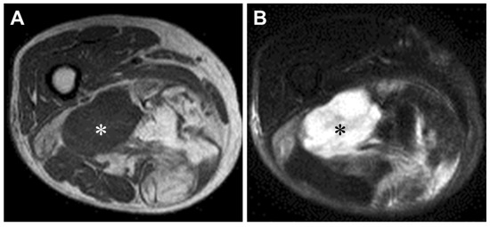 Magnetic resonance imaging of dedifferentiated liposarcoma in the right thigh of an 83-year-old woman. Axial T1-weighted (A) and T2-weighted spectral presaturation with inversion recovery (B) sequences display a large soft tissue mass composed of non-lipomatous (white and black asterisks) and juxtaposed lipomatous components.