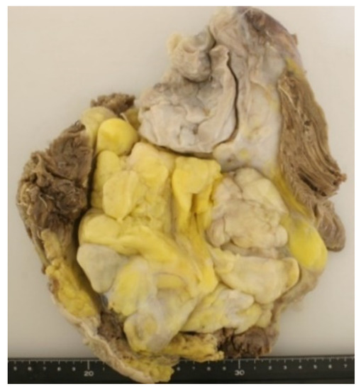 Cut surface showing a multilobulated appearance with gray-white and yellow areas.