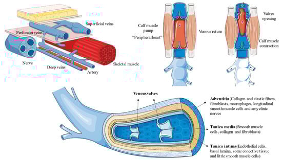 Varicose veins (VVs) are the most common manifestation of CVD. Other venous signs of CVD include telangiectasias and reticular veins. Despite these, clinical signs may affect any vein in the body, the venous system located in the lower limbs is often the most vulnerable structure to suffer CVD []. This is mainly due to the increased resistance to overcome by the gravitational force, which is notably higher than the rest of regions in the body. In the lower limbs, three great systems may be distinguished: superficial veins, represented mainly by the great saphenous vein, the small saphenous vein, the anterior accessory saphenous vein and their tributaries; deep veins, the major transporter of blood flow; and perforating veins, connecting both systems []. From a histological perspective, veins are conformed by three layers: (1) tunica intima or inner layer, mainly conformed by endothelial cells (ECs); (2) the tunica media or media layer, represented by vascular smooth muscle cells (SMCs) and little elastic fibers; and (3) tunica adventitia or outer layer, which is composed by connective tissue, with an important development of elastic fibers, giving the vessel an important support and elasticity []. In the case of VV however, the normal structure of the vein is altered, with prominent changes in the thickness and composition of the venous wall []. In addition, veins present venous valves, bicuspid prolongations from the venous tissue essential to maintain the blood flow in the proper direction, impeding venous reflux []. Furthermore, different muscle pumps act coordinately with the venous valves to assure the unidirectional blood flow. The calf muscle, often named the “peripheral heart”, is especially considered the most prominent enhancer of venous return from lower limbs to heart []. Importantly, failures in both systems are also crucial to understand the pathogenesis and progression of CVD leading to a venous reflux and to venous stasis [,,,]. The anatomy of the venous system in the lower limbs, its physiology, and histology are briefly summarized in Figure 1.