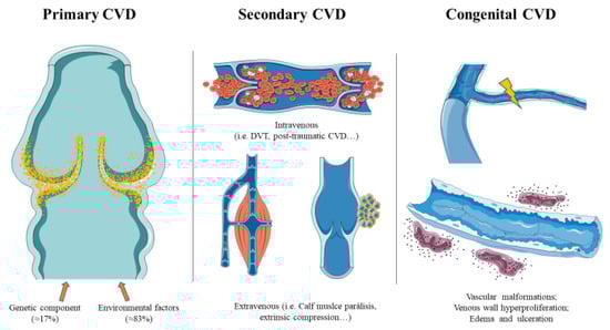 CVD is a vascular disorder in which venous return is compromised. According to the CEAP classification, the etiology of CVD could be as follows: (1) primary CVD; (2) secondary CVD, which in turn are divided into (i) intravenous secondary causes; (ii) extravenous secondary causes; and (3) congenital CVD [].