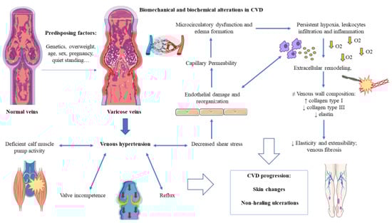 CVD is a multifactorial disease involving complex pathophysiological mechanisms. The increased ambulatory venous pressure and vein dilation in the lower limbs promotes an intricate vascular response, leading to stasis and consequent secondary inflammatory response, and altered shear stress. Obstruction and/or reflux are the two main pathomechanisms leading to significant changes in the venous wall and pathological venous reflux, thereby contributing to the progression of CVD []. Moreover, these changes provide the creation of a hypoxic environment, which is thought to be an important contributor in the pathophysiology of the disease. Moreover, the role of certain gene mutations or variants are also implicated either in the etiology or pathophysiology of the disease. Similarly, epigenetic alterations have also been found in patients with CVD, as well as evidence of systemic markers of damage related to the progression of the disease [,,,]. In this section we will collect the current knowledge of these pathophysiological mechanisms occurring in CVD in order to understand the most important properties of the disease.