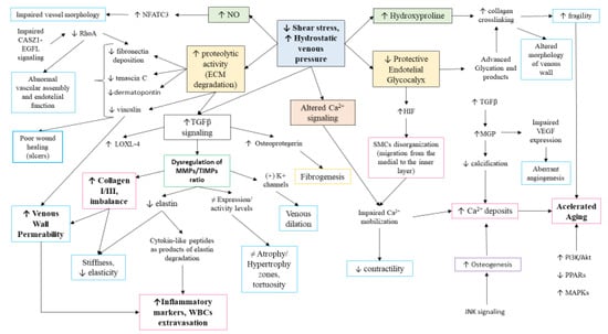 Matrix Gla protein (MGP) has a prominent role in mineralization, which is boosted in SMCs of VVs []. This protein is a central inhibitor of vascular calcification via carboxylation by vitamin K although the accurate mechanism is not clearly understood []. It is suggested that MGP must be a predictor for calcification status of VV whose modus operandi can be expressed in different ways: inhibition of calcium phosphate precipitation, formation of matrix vesicles, formation of apoptotic bodies, and transdifferentiation of vascular SMCs []. For its part, MGP induces TGFβ expression and parallel, induces VEGFs expression, which promotes angiogenesis, lymphangiogenesis, and vascular permeability. Some ex vivo studies have shown that by blocking TGFβ with antibodies, MGP does not have effect on VEGF upregulation []. As described, MGP, VEGF, cell–cell junctions and more elements depend on Ca2+ signaling, which is key for vascular tone and function to respond to hydrostatic pressure. It is known that the regulation of voltage dependent Ca2+ channels is altered with aging processes and hence affects vascular function []. Furthermore, some studies reported that primary VV show aberrant release of VEGF, which, in combination with other altered molecules, might increase the permeability of venous wall, allowing the infiltration of inflammation markers [].