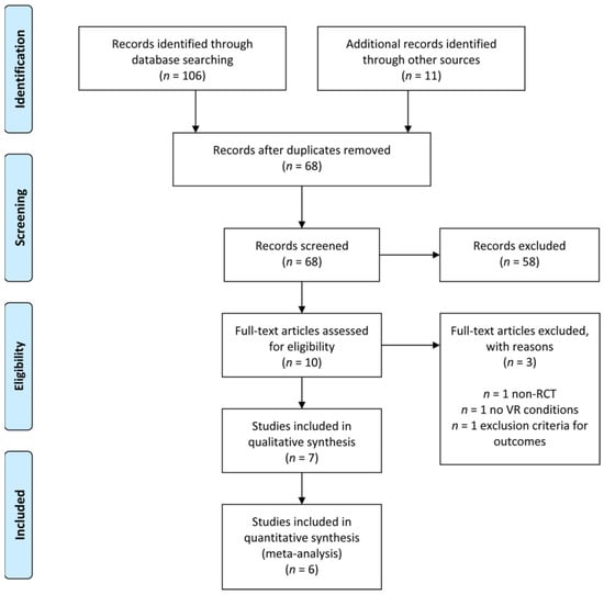 The electronic search identified 106 results overall, and 11 studies were added from the grey literature search. After removing 49 duplicates, 68 abstracts were included for screening. 58 records were excluded due to their unrelated topic and 10 full-text articles were assessed for eligibility. Finally, 7 studies met the inclusion criteria and underwent a qualitative analysis. Three full-text articles were excluded after eligibility assessment, due to different reasons: n = 1—non RCT, n = 1 no VR environment and n = 1 exclusion criteria for outcomes. One further study was excluded due to insufficient data, leaving six studies that were included in the meta-analysis. The PRISMA flowchart presents the review process (Figure 1).