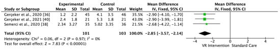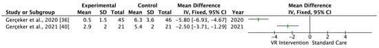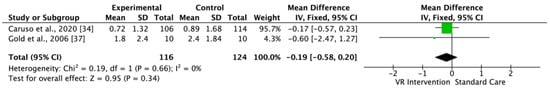 Two studies, with 240 patients overall, were analyzed for pain score after a needle-related procedure. As the outcome measures in the included studies were performed using the Faces Pain Scale–Revised (FPS-R), the analysis was performed using MD with a fixed effect model. No significant difference was found between VR Treatment and standard care for pain score (MD = −0.19; 95% CI −0.58, 0.20; I2 = 0%) (Figure 4).