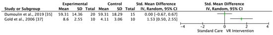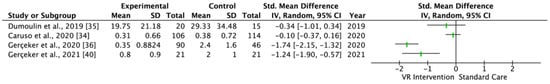 Four of the included studies noted a large effect size [,,,], whereas studies by Caruso et al. [] and Dumoulin et al. [] noted a small effect size of VR interventions. The data of the study by Wint et al. [] were insufficient to assess the effect size.
