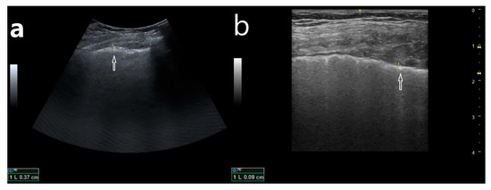 (a) B-line artifacts, arising from an apparently thickened pleural line when it was evaluated with a convex transducer (3.1 mm); (b) evaluation of the pleural line in the same localization, the pleural line of normal thickness, assessed with a linear transducer (0.09 mm).