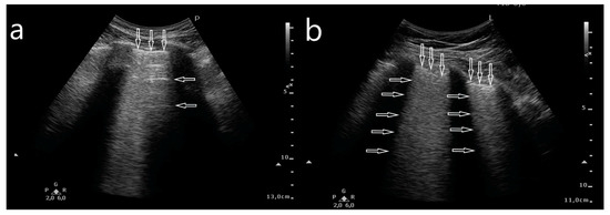 B-line artifacts evaluated with a convex transducer: (a) A-line artifacts (horizontal arrows) and pleural line (vertical arrow). (b) White lung: pleural line (vertical arrow) and confluent B-line artifacts (horizontal arrows).