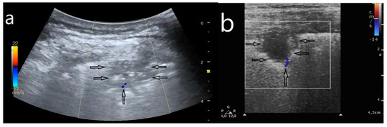 Subpleural consolidation due to pulmonary embolism secondary to COVID-19. (a,b) Wedge-shaped subpleural consolidation (horizontal arrows), with a ‘vascular sign’—flow amputation visible in Color Doppler (vertical arrow).
