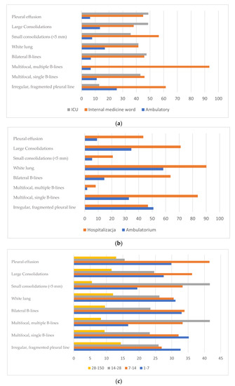 Figures demonstrate the presence of specific LUS findings in patients with the SARS-CoV-2 infection depending on: (a) place of treatment (ambulatory, department of internal medicine, intensive care unit), (b) treatment mode (ambulatory and hospitalization), (c) period of illness.