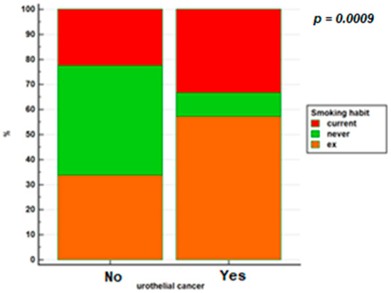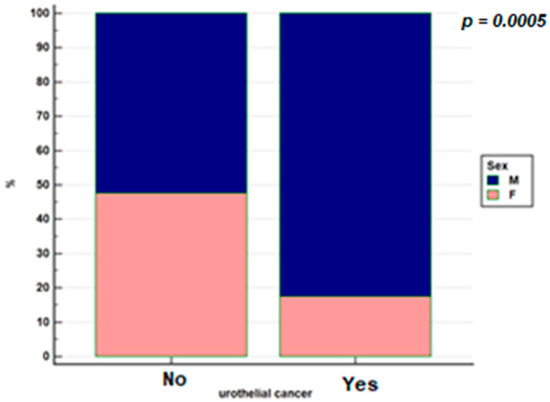 Important is the finding in our study of an increased frequency of urothelial cancer in male patients with IBD. This figure is in line with that of the general population: an increased incidence of urothelial cancer in men is known (24,000 new diagnoses in men against 5700 diagnoses in women, in 2019) [7]. This is mainly explained by the different incidence of risk factors in the male population, mainly with regard to smoking and occupational exposure to carcinogens [8,28].