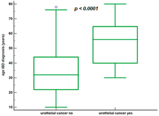 Age at diagnosis of IBD based on whether or not urothelial cancer has developed.