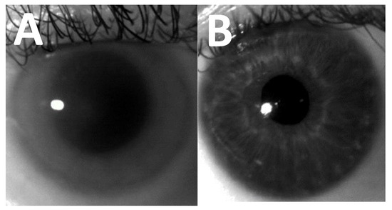 (A) Corneal image of a patient with MPS I Hurler demonstrating significant corneal clouding. (B) Corneal image of a patient without corneal clouding. Images were taken using IrisGuard AD100, MREH.