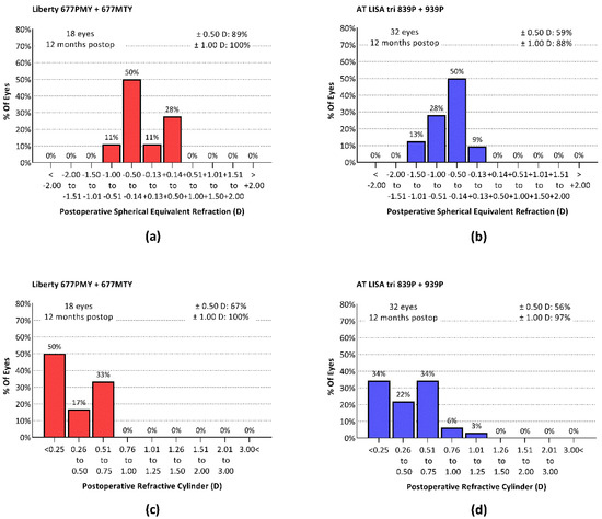 At postoperative month 12 in the Liberty group, the residual SEQ was ± 0.5 D of emmetropia in 89% of eyes and ± 1.0 D in 100% of eyes (Figure 1a). In the AT LISA tri group, residual SEQ was ± 0.5 D of emmetropia in 59% of eyes and ± 1.0 D in 88% (Figure 1b). The analysis of residual astigmatism similarly showed better outcomes in the Liberty IOL group (Figure 1c,d).