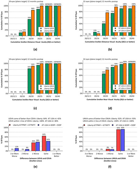 Snellen UDVA 20/25 or better (logMAR 0.1) was achieved by 89% of Liberty eyes and 75% of AT LISA tri eyes (Figure 2a,b). Snellen UNVA of 20/25 or better was achieved by 94% of Liberty eyes and 88% of AT LISA tri eyes (Figure 2c,d). The UDVA was within one line of the CDVA in 100% of Liberty eyes and 80% of AT LISA tri eyes (Figure 2e). In both groups, UNVA was within one line of CDVA in all eyes (Figure 2f). None of the above differences between groups achieved statistical significance.