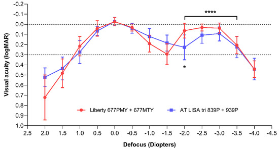 Monocular defocus curves of the two IOL models, plotted 12 months after surgery. Pairwise comparisons showed a significant difference only at the −2.0 D defocus value (*), while the area under curve analysis confirmed superior near vision performance for the Liberty IOL (p = 0.0004; ****).