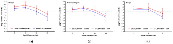 Contrast sensitivity, measured in different light conditions at 12 months postoperatively. (a) In photopic conditions. (b) In photopic conditions with glare. (c) In mesopic conditions (measurements not obtained at 18 cpd). cpd = cycles per degree.