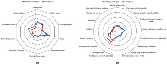 Blurred far vision was reported by a minority of the Liberty patients, and more often by patients in the AT LISA tri group (Figure 6a; Supplementary Table S5). Glare and flare were the most common dysphotopic phenomena, although most patients rated them as representing no, minor, or moderate difficulties. Major concerns were only reported by AT LISA tri patients (Figure 6b).