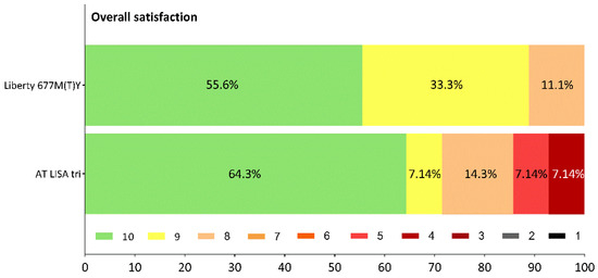 The majority of patients were highly satisfied with the surgical outcomes and their postoperative quality of vision (Figure 7). Only a few complaints came from the AT LISA tri cohort: although all patients (100%) from the Liberty group achieved spectacle independence for far and near vision, and only one patient of the nine (11.1%) required spectacles for intermediate vision from time to time, 14.3% of the AT LISA tri subjects often needed their glasses for far vision and 7.1–7.1% often needed to wear spectacles for intermediate and near vision.