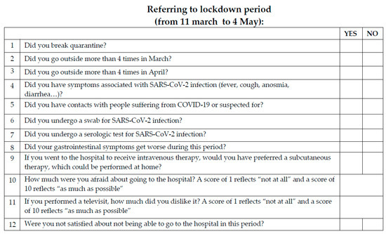 We administered to all patients the Hospital Anxiety and Depression Scale (HADS) questionnaire [24] and other 12 questions (Figure 1), specifically related to COVID-19 and its implications (quarantine, telemedicine, etc.), asking them to evaluate the period of the Italian lockdown (11 March–4 May). Thus, we investigated whether the lockdown situation had an impact on the perception of anxiety related to IBD treatment and to the need to move to high-risk places (i.e., hospitals or infusion centres). Regarding the HADS questionnaire, normal scores for anxiety or depression were defined by a score less than 8; a subscore from 8 to 10 was defined as borderline abnormal, and a score from 11 to 21 as abnormal [24]. In order to explore only the impact of the anxiety related to IBD and COVID, we excluded from the study patients with other comorbidities, immune-related (such as psoriasis, arthritis, etc.) or non-immune-related (such as a known metabolic, cardiovascular, or psychiatric disease, as well as the use of drugs that interfere with the nervous system for any reason). Furthermore, we excluded from the study pregnant women and patients who refused to give informed consent to participate to the study.
