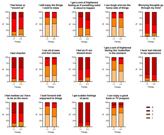 Among patients who needed access to the hospital, only one out of four would have preferred to be treated at home with s.c. therapy and was afraid of being infected in the hospital. IBD symptoms such as diarrhoea mildly worsened in 10 (8.9%) patients treated with i.v. drugs and 4 (5.2%) patients treated with s.c. drugs (p = 0.41), but the increase in PMS or in HBI was not sufficient to define a disease relapse in any patient (hospitalized vs. non-hospitalized, p = ns). Moreover, the two groups of patients had similar scores in the 14 single items of the HADS questionnaire (p > 0.10 for all) (Figure 2). The total HADS score obtained by the sum of all items was also almost identical between groups (37.1 ± 2.8 vs. 37.2 ± 2.8; p = 0.98). The two groups of patients had similar scores in the 14 single items of the HADS questionnaire (p > 0.10 for all) (Figure 2). The total HADS score obtained by the sum of all items was also almost identical between groups (37.1 ± 2.8 vs. 37.2 ± 2.8; p = 0.98).