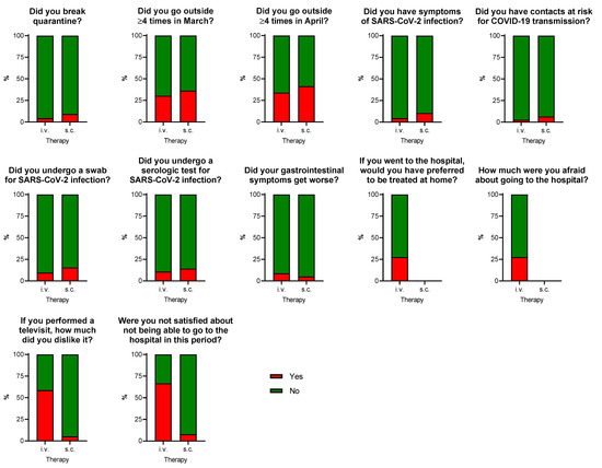 Among COVID-related questions (Figure 3), most (93.7%) participants declared they had strictly followed the quarantine rules over the lockdown period, going outside no more than once a week (four times each month) in March and April 2020. Thirteen (6.9%) patients had symptoms compatible with SARS-CoV-2 infection and eight (4.3%) had strict contacts with people with typical symptoms, without group differences (all p > 0.05). Thirty-seven (19.5%) patients underwent at least a diagnostic test for SARS-CoV-2 infection (molecular swab and/or serologic testing) with negative results. IBD symptoms such as diarrhoea mildly worsened in 10 (8.9%) patients treated with i.v. drugs and 4 (5.2%) patients treated with s.c. drugs (p = 0.41), but the increase in PMS or in HBI was not sufficient to define a disease relapse. Among patients who needed an access to the hospital, only one out of four would have preferred to be treated at home with s.c. therapy and was afraid to be infected in the hospital.