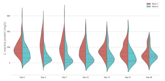 Temporal changes in C-reactive protein levels in the first and second wave. Violin plots represent distribution of data. Dashed lines show medians and interquartile ranges. The general linear model indicates significant differences between days in wave 1 and between groups, p < 0.001.