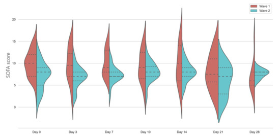 Temporal changes in SOFA scores in the first and second wave. Violin plots represent the distribution of data. Dashed lines show medians and interquartile ranges. The general linear model indicates significant differences between days in wave 1 and between groups, p < 0.001.