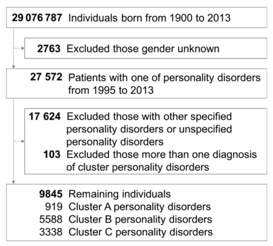 We included patients with a diagnosis of cluster A PDs (ICD: 301.0, 301.20, 301.22), cluster B PDs (ICD: 301.50, 301.7, 301.81, 301.83), or cluster C PDs (ICD: 301.4, 301.6, 301.82) during the period between 1 January 1995 and 31 December 2013. To ensure diagnostic validity, patients were defined as an ICD code of the same cluster PDs based on the diagnostic interviews and clinical judgments of psychiatrists in inpatient or outpatient settings at least twice; such a definition was adopted in a previous study []. For each patient, the date of diagnosis (age at diagnosis) was defined as the first day of the diagnosis of PDs. Furthermore, we excluded patients with an unknown gender status, diagnoses of other specified PDs or unspecified PDs, and diagnoses of more than one cluster PDs. For example, a patient with diagnoses of cluster A and cluster C at a different time within the study period would have been excluded.