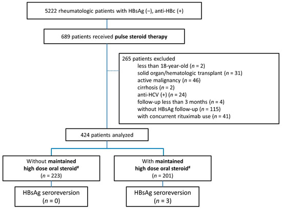The flowchart of patient recruitment is shown in Figure 1. In total, 5222 HBsAg-negative, anti-HBc-positive rheumatic patients were identified. Amongst them, 689 patients received GC pulse therapy, exclusively methylprednisolone 500 mg for 3 days. After excluding patients younger than 20 years, those with concurrent comorbidities, those who were followed up less than 3 months, those without follow-up HBsAg, and those with concurrent use of rituximab, a remaining 424 patients were analyzed. The demographic characteristics are shown in Table 1.