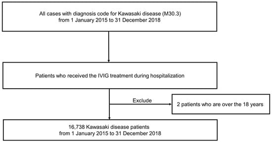 We extracted data regarding KD from the HIRA, which is a government-affiliated organization created to build an accurate claims review and quality assessment system for the National Health Insurance, with databases open for all academic investigators [,,]. Claims data in the HIRA database include patient diagnosis, treatment, procedures, surgical history, and prescription drugs, serving as a valuable resource for healthcare service research. We studied the HIRA data of KD patients who received IVIG treatment (ICD-10, M30.3), including a total of 16,740 incident KD cases between 1 January 2015, and 31 December 2018 (Figure 1). Most patients were under 18 years of age, with only two patients older than 18 years. Thus, only 16,738 KD patients were analyzed, excluding the two patients aged >18 years.