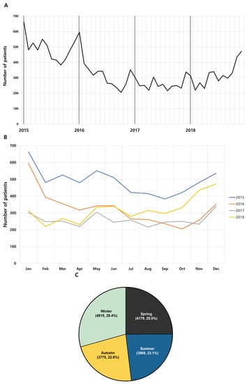 Of the 16,738 patients under 18 years of age, 5870 were diagnosed in 2015, 3922 in 2016, 3111 in 2017, and 3835 in 2018. The highest incidence rate in 2015–2016 was in January, and in 2017–2018, it was highest in December (Table 3). Overall, the cumulative cases per month for four years were found to be the highest in January and the lowest in September (Figure 2A,B). Additionally, KD patients were most often diagnosed during winter (29.4%), followed by spring (25.0%), summer (23.1%), and then autumn (22.6%) (Figure 2C). The average number of cases per month was 348.7, and the average number of cases per year between 2015 and 2018 was 4184.5.