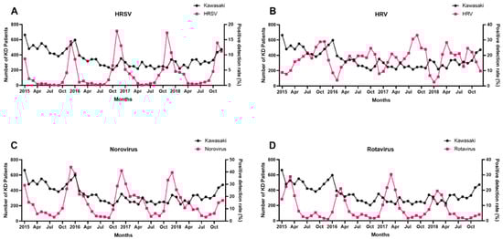 If any prevalent virus affected KD diagnosis, the prevalence of that virus might increase before the peak of KD diagnosis. Thus, a Granger causality test was conducted between the virus PDR and KD diagnostic data collected 1 to 2 months later. The results of this test are shown in Table 4. Among the seven respiratory and four gastrointestinal viruses, the prevalence of certain viruses increased 1–2 months before the KD incidence increased. The PDRs for HRSV (p < 0.001), rotavirus (p = 0.048), and norovirus (p < 0.001) in patients aged <5 years correlated with increased KD incidence after 1 month (Table 4A); however, there was no statistical correlation between KD incidence and patients aged 5–18 years, and rotavirus was not statistically correlated at 1–5 years of age. Moreover, the PDRs for HRSV (p < 0.001), HRV (p = 0.001), rotavirus (p = 0.032), and norovirus (p < 0.001) in patients aged <5 years correlated with increased KD incidence after 2 months (Table 4B). There was no statistical correlation between KD incidence and patients aged 5–18 years, and rotavirus was also not statistically correlated at 1–5 years of age. Figure 3 shows the relationship between the PDRs of HRSV, HRV, norovirus, rotavirus, and KD incidence during the study period.