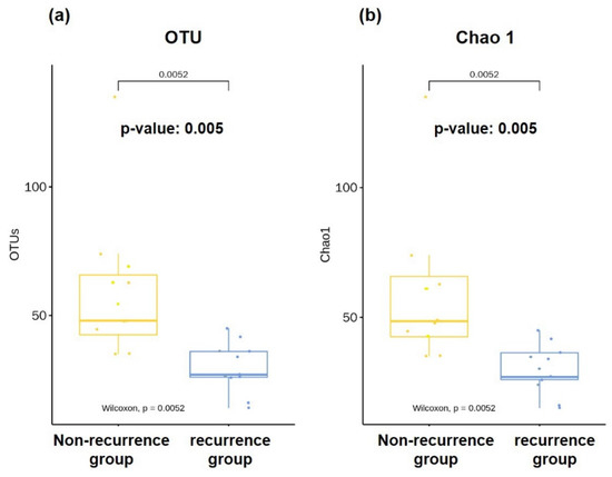 A total of 303 bacterial species were identified from 20 bile samples. The average OTU, obtained by calculating the mean values after counting the number of observed OTUs in each sample, was reduced in the 11 individuals with CBD stone recurrence compared to the 9 with non-recurrence (29.6 ± 3.6 vs. 60.4 ± 11.6, p = 0.0005, Wilcoxon rank-sum test; Figure 1a). The expected total number of OTUs for each group, as estimated by the Chao1 estimator, was also considerably lower in the recurrence group than in the non-recurrence group (29.8 ± 3.5 vs. 60.5 ± 11.6, p = 0.005, Wilcoxon rank-sum test; Figure 1b).