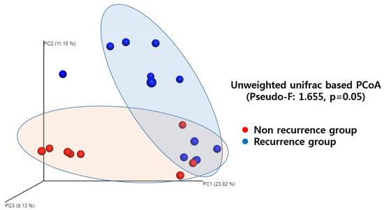 The unweighted UniFrac distance metric, which measures the similarity in the microbial communities of the bile samples (β-diversity), revealed an overall microbial composition difference between the two groups (unweighted UniFrac, PERMANOVAR, pseudo-F: 1.655, p = 0.05, Figure 3). This result indicates that the microbiome clustering in the recurrence group was different from that of the non-recurrence group.
