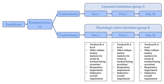 After inclusion, patients were randomized 1:1 into two groups: group 1 received a liposomal inhalation (LipoAerosol®, Optima Medical Swiss AG, Zug, Switzerland), containing phospholipids, which is a major component of surfactant, and group 2 received an inhalation with physiologic saline inhalation, the current gold standard, from the first to the tenth day after surgery, five times at 30 min per day (PARI NaCl Inhalation Solution, Starnberg, Germany). The liposomal inhalation contains liposomes, i.e., phospholipid bilayer vesicles, which shape the main constituents of surfactant film, which covers the air/liquid interface on the airways from the lower to the upper respiratory system []. LipoAerosol® is a medical device in accordance with Medical Device Directive 93/42/ECC, which obtained CE-marking in 2012 as the first commercially available liposomal inhalation solution and is based on a physiological saline solution with the addition of phospholipid-liposomes made of highly purified lecithin. The further study flow is depicted in Figure 1. Two physicians were involved in every included patient. The first physician was responsible for the randomization and the preparation of the solution for the inhalation. The study inhalation was prepared in an opaque container to prevent another person from distinguishing the different inhalative agents from each other. Both the patient and the second physician, who performed the examinations during the study period, were blinded towards the used inhalative agent. In all patients in both groups heat and moist exchanger (HME) filters were used. The inhalation was prepared by a physician, who was not involved in the further examinations. All included patients were inpatient for the entire study period.