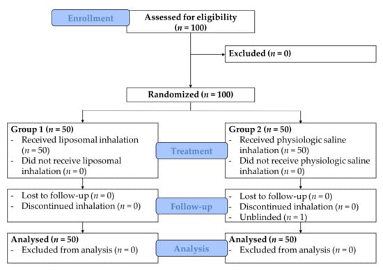The study populations consisted of 100 patients of whom 50 were randomized to receive a liposomal inhalation in the postoperative phase after tracheostomy and 50 patients were randomized to receive an inhalation with physiologic saline. Patients were recruited between June 2016 and June 2017. The CONSORT flow chart is depicted in Figure 2.